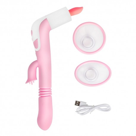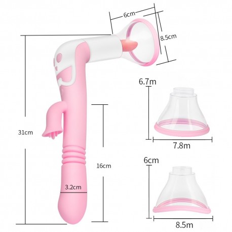 Pordero estimulador de clitoris con de lengua y succionador, en su extremo cuenta con un estimulador de clitoris y un estimulador de punto g, de empuje
